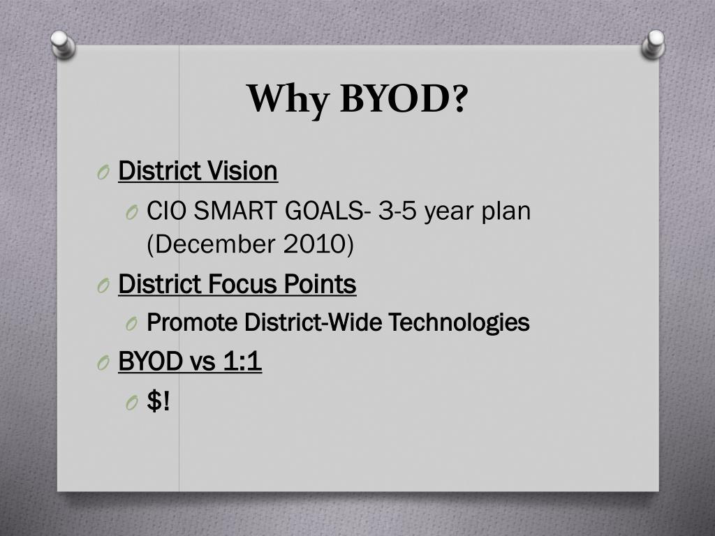 Why BYOD? • District Vision • CIO SMART GOALS- 3-5 year plan (December 2010) • District Focus Points • Promote District-Wide Technologies • BYOD vs 1:1 • $!