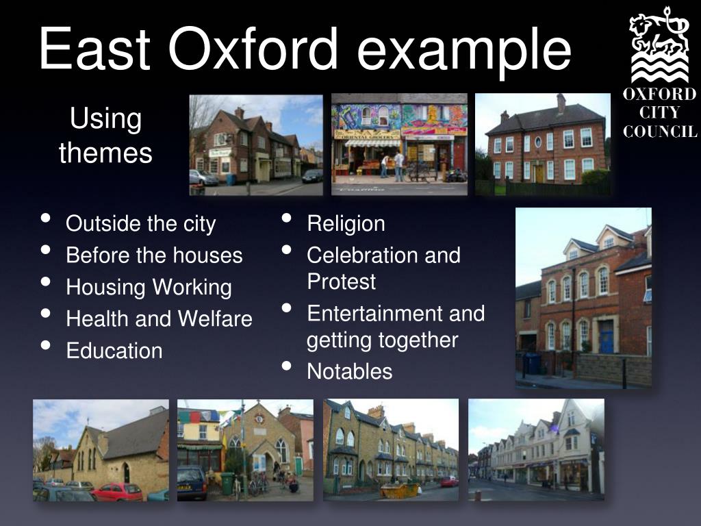 East Oxford example Using themes • Outside the city • Before the houses • Housing Working • Health and Welfare • Education • Religion • Celebration and Protest • Entertainment and getting together • Notables