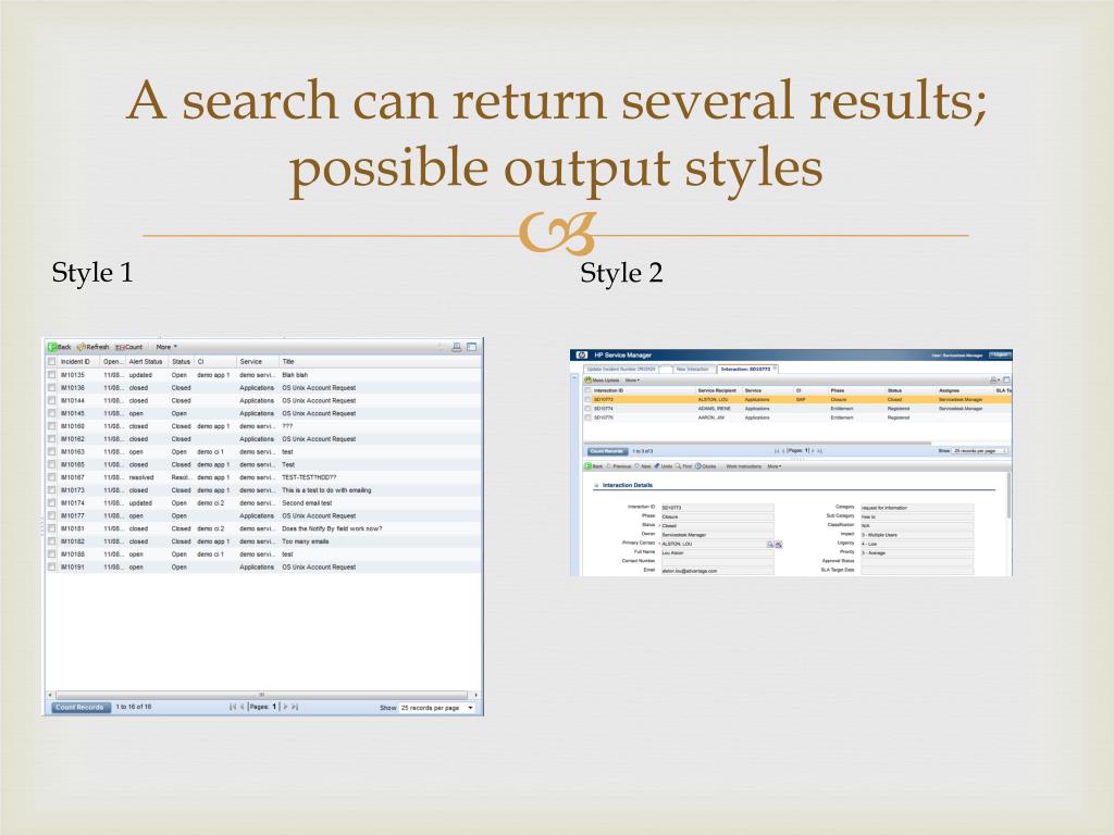 A search can return several results; possible output styles Style 1 Style 2