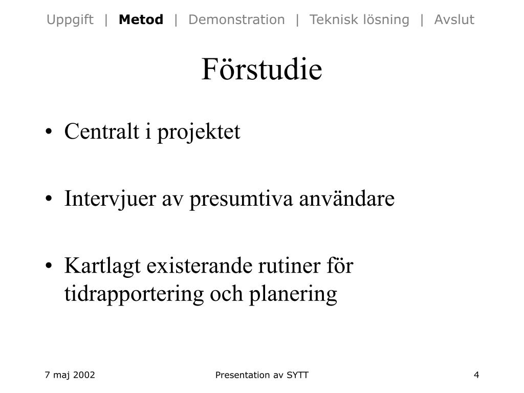 Uppgift | Metod | Demonstration | Teknisk lösning | Avslut Förstudie • Centralt i projektet • Intervjuer av presumtiva användare • Kartlagt existerande rutiner för tidrapportering och planering Presentation av SYTT