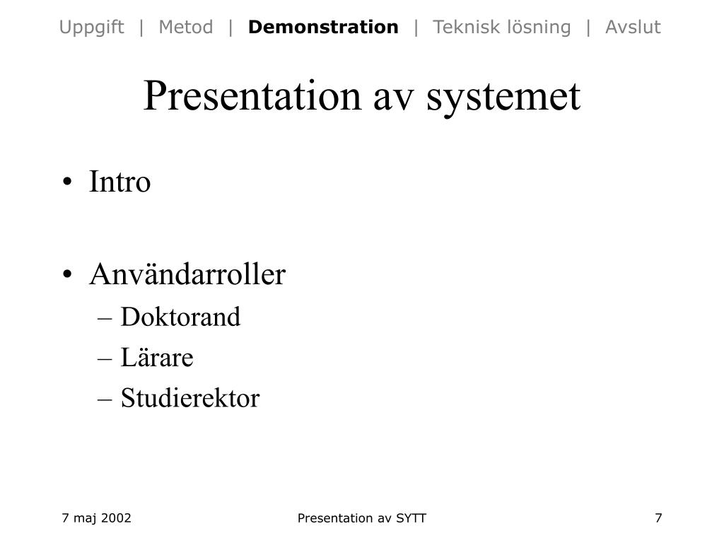 Uppgift | Metod | Demonstration | Teknisk lösning | Avslut Presentation av systemet • Intro • Användarroller • Doktorand • Lärare • Studierektor Presentation av SYTT