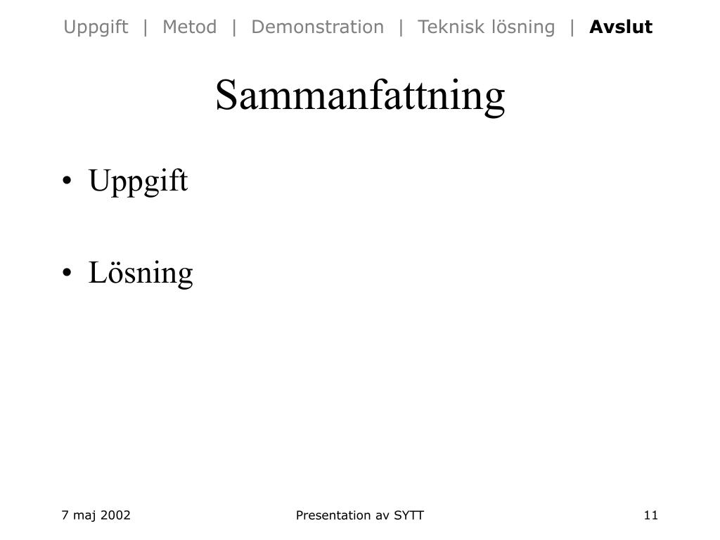 Uppgift | Metod | Demonstration | Teknisk lösning | Avslut Sammanfattning • Uppgift • Lösning Presentation av SYTT