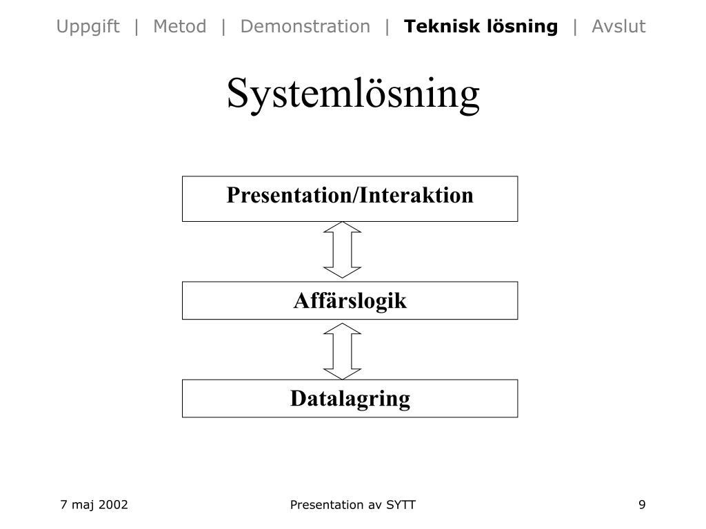 Presentation/Interaktion Affärslogik Datalagring Uppgift | Metod | Demonstration | Teknisk lösning | Avslut Systemlösning Presentation av SYTT