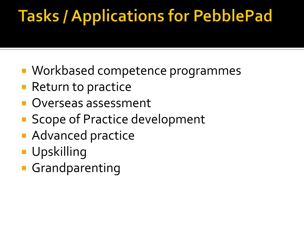 Tasks / Applications for PebblePad • Workbased competence programmes • Return to practice • Overseas assessment • Scope of Practice development • Advanced practice • Upskilling • Grandparenting
