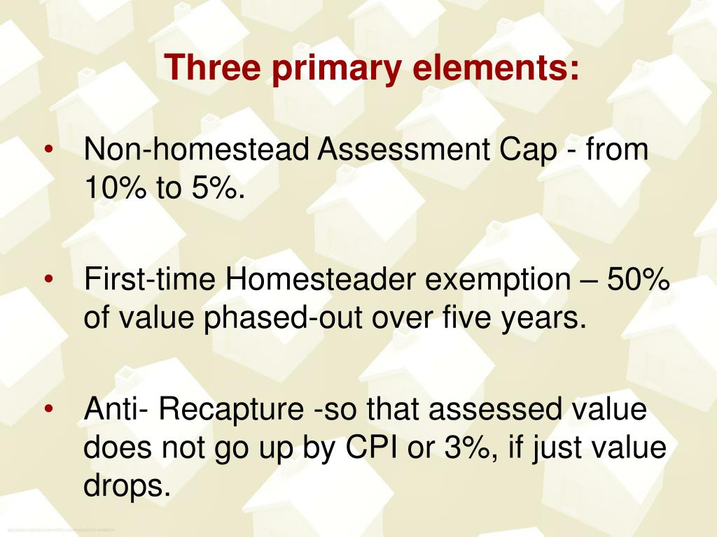 Three primary elements: • Non-homestead Assessment Cap - from 10% to 5%. • First-time Homesteader exemption – 50% of value phased-out over five years. • Anti- Recapture -so that assessed value does not go up by CPI or 3%, if just value drops.