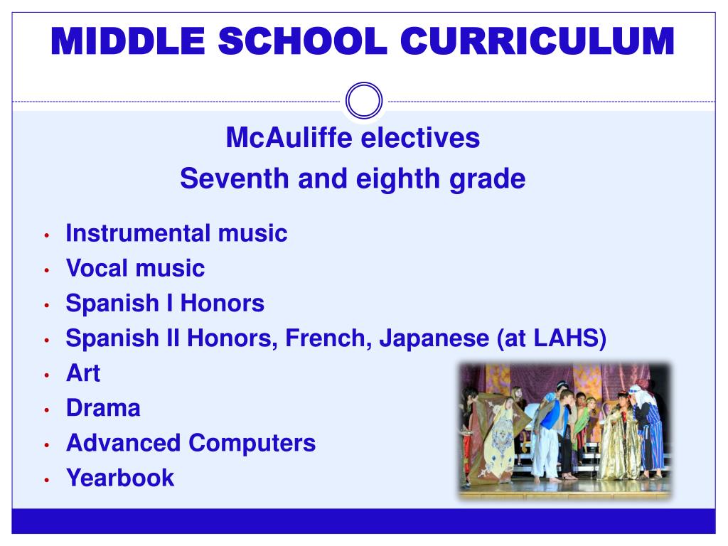 MIDDLE SCHOOL CURRICULUM McAuliffe electives Seventh and eighth grade • Instrumental music • Vocal music • Spanish I Honors • Spanish II Honors, French, Japanese (at LAHS) • Art • Drama • Advanced Computers • Yearbook