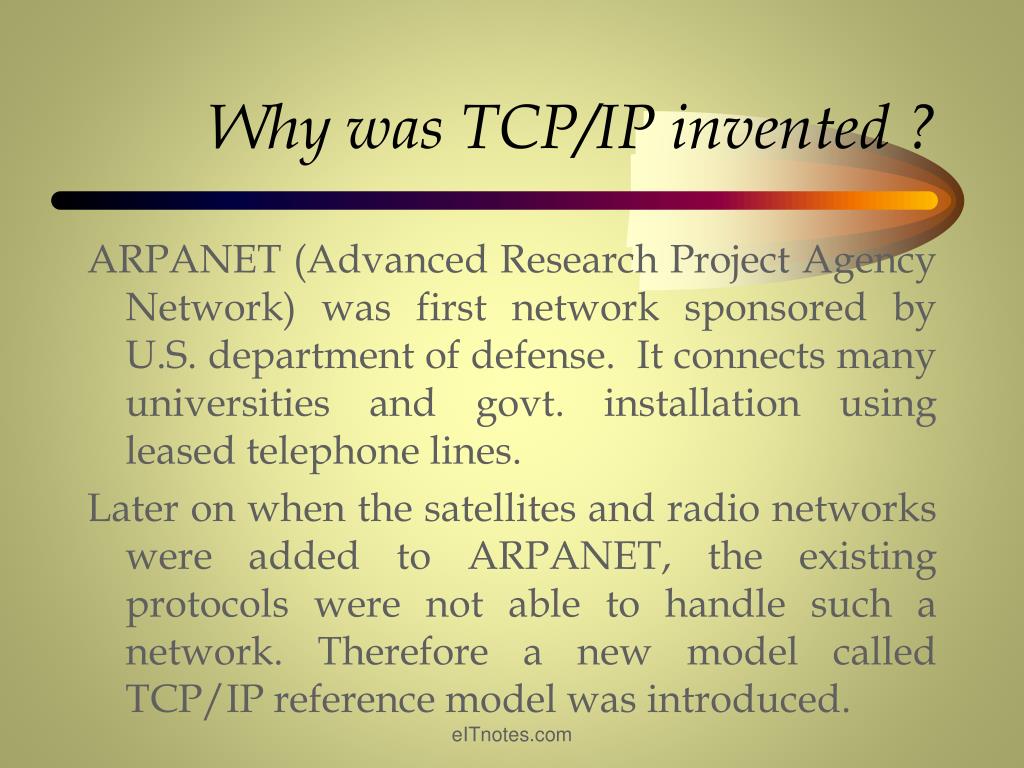 Why was TCP/IP invented ? ARPANET (Advanced Research Project Agency Network) was first network sponsored by U.S. department of defense. It connects many universities and govt. installation using leased telephone lines. Later on when the satellites and radio networks were added to ARPANET, the existing protocols were not able to handle such a network. Therefore a new model called TCP/IP reference model was introduced. eITnotes.com