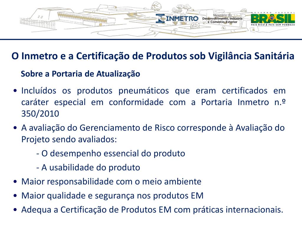 O Inmetro e a Certificação de Produtos sob Vigilância Sanitária Sobre a Portaria de Atualização • Incluídos os produtos pneumáticos que eram certificados em caráter especial em conformidade com a Portaria Inmetro n.º 350/2010 • A avaliação do Gerenciamento de Risco corresponde à Avaliação do Projeto sendo avaliados: • - O desempenho essencial do produto • - A usabilidade do produto • Maior responsabilidade com o meio ambiente • Maior qualidade e segurança nos produtos EM • Adequa a Certificação de Produtos EM com práticas internacionais.
