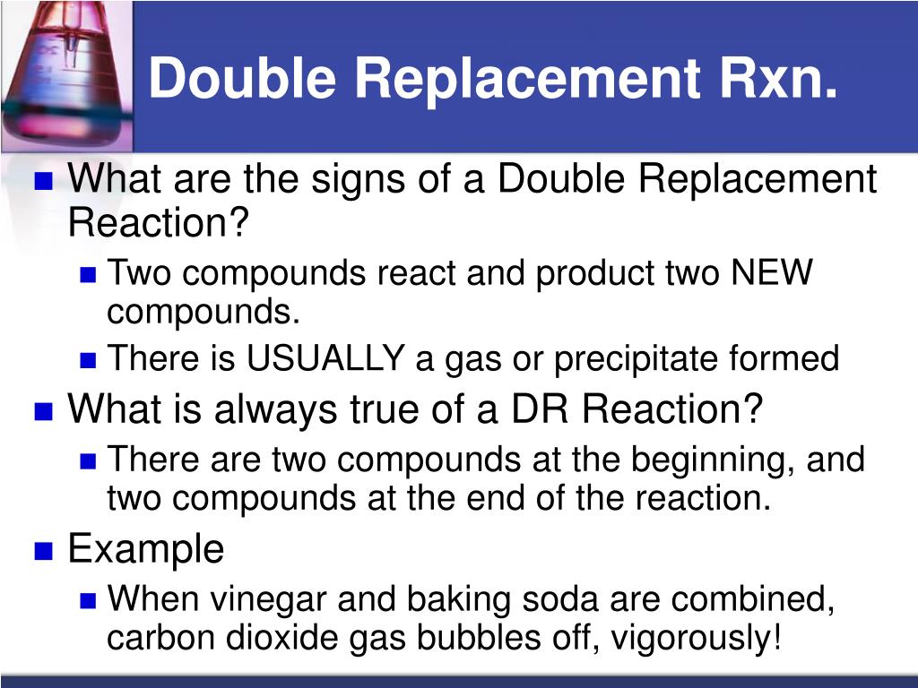 Double Replacement Rxn. • What are the signs of a Double Replacement Reaction? • Two compounds react and product two NEW compounds. • There is USUALLY a gas or precipitate formed • What is always true of a DR Reaction? • There are two compounds at the beginning, and two compounds at the end of the reaction. • Example • When vinegar and baking soda are combined, carbon dioxide gas bubbles off, vigorously!