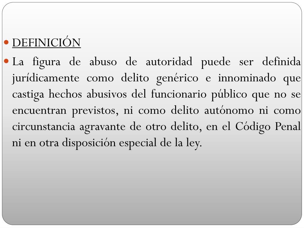 DEFINICIÓN La figura de abuso de autoridad puede ser definida jurídicamente como delito genérico e innominado que castiga hechos abusivos del funcionario público que no se encuentran previstos, ni como delito autónomo ni como circunstancia agravante de otro delito, en el Código Penal ni en otra disposición especial de la ley.