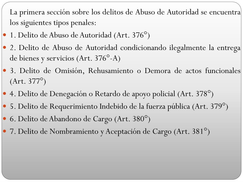 La primera sección sobre los delitos de Abuso de Autoridad se encuentra los siguientes tipos penales: • 1. Delito de Abuso de Autoridad (Art. 376°) • 2. Delito de Abuso de Autoridad condicionando ilegalmente la entrega de bienes y servicios (Art. 376°-A) • 3. Delito de Omisión, Rehusamiento o Demora de actos funcionales (Art. 377°) • 4. Delito de Denegación o Retardo de apoyo policial (Art. 378°) • 5. Delito de Requerimiento Indebido de la fuerza pública (Art. 379°) • 6. Delito de Abandono de Cargo (Art. 380°) • 7. Delito de Nombramiento y Aceptación de Cargo (Art. 381°)