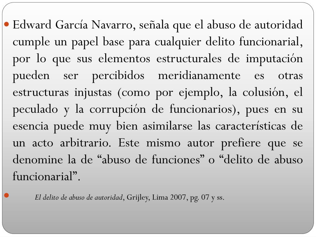 Edward García Navarro, señala que el abuso de autoridad cumple un papel base para cualquier delito funcionarial, por lo que sus elementos estructurales de imputación pueden ser percibidos meridianamente es otras estructuras injustas (como por ejemplo, la colusión, el peculado y la corrupción de funcionarios), pues en su esencia puede muy bien asimilarse las características de un acto arbitrario. Este mismo autor prefiere que se denomine la de “abuso de funciones” o “delito de abuso funcionarial”. El delito de abuso de autoridad, Grijley, Lima 2007, pg. 07 y ss.