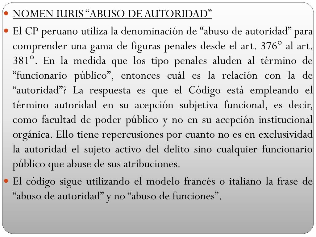 NOMEN IURIS “ABUSO DE AUTORIDAD” El CP peruano utiliza la denominación de “abuso de autoridad” para comprender una gama de figuras penales desde el art. 376° al art. 381°. En la medida que los tipo penales aluden al término de “funcionario público”, entonces cuál es la relación con la de “autoridad”? La respuesta es que el Código está empleando el término autoridad en su acepción subjetiva funcional, es decir, como facultad de poder público y no en su acepción institucional orgánica. Ello tiene repercusiones por cuanto no es en exclusividad la autoridad el sujeto activo del delito sino cualquier funcionario público que abuse de sus atribuciones. El código sigue utilizando el modelo francés o italiano la frase de “abuso de autoridad” y no “abuso de funciones”.
