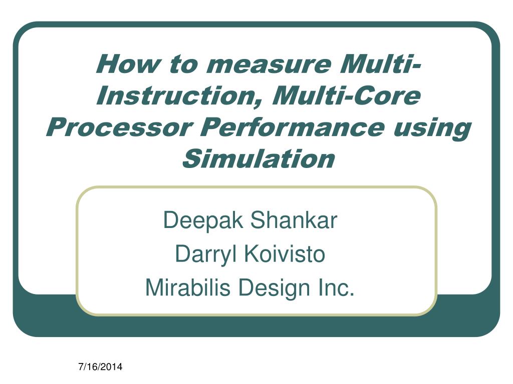 How to measure Multi-Instruction, Multi-Core Processor Performance using Simulation . Deepak Shankar Darryl Koivisto Mirabilis Design Inc. Multi-Core/Processor Benchmarking Solution. Speedup equations that take into account parallel execution Speedup_Factor, Multi_Instr_Mhz, Multi_Core_Mhz