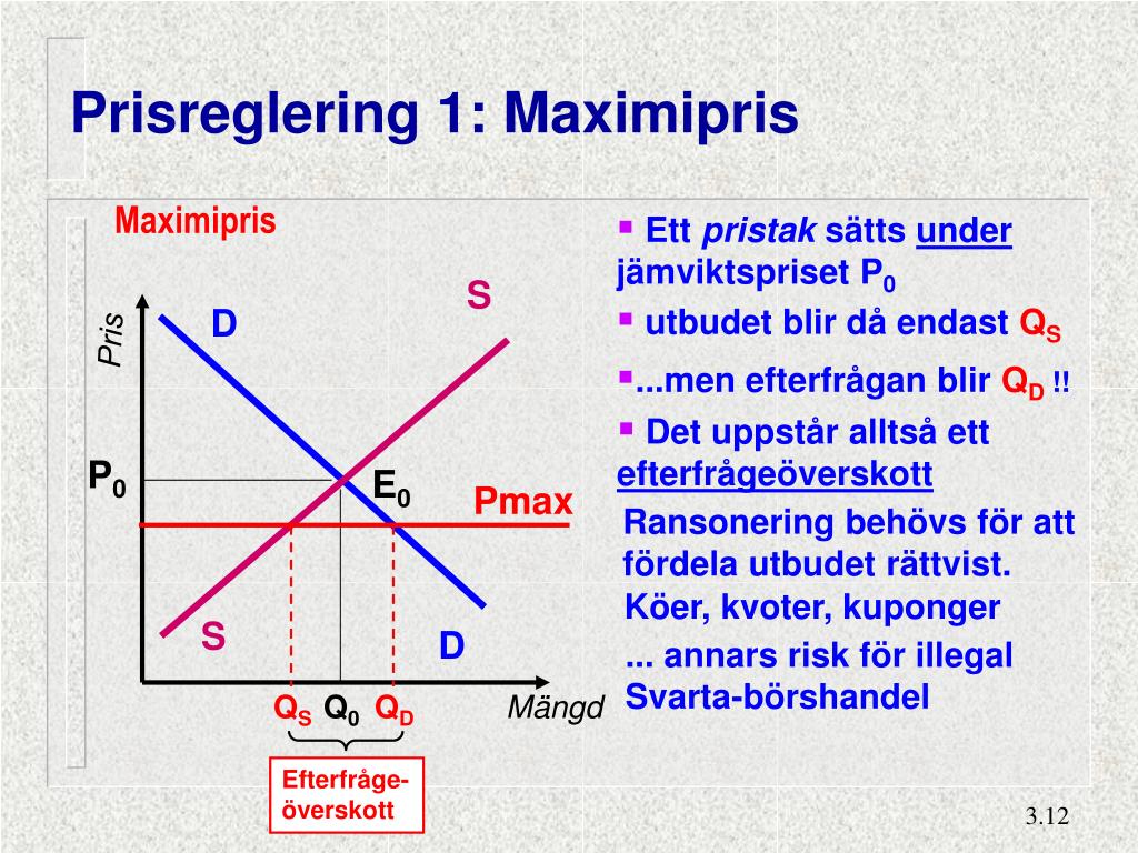 Prisreglering 1: Maximipris Maximipris • Ett pristak sätts under jämviktspriset P0 S D • utbudet blir då endast QS Pris • ...men efterfrågan blirQD !! • Det uppstår alltså ett efterfrågeöverskott P0 E0 Pmax Ransonering behövs för att fördela utbudet rättvist. Köer, kvoter, kuponger S D ... annars risk för illegal Svarta-börshandel QS Q0 QD Mängd Efterfråge- överskott