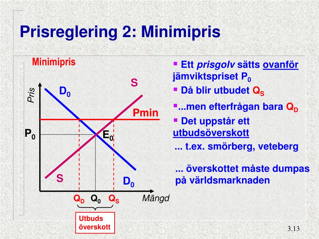 Prisreglering 2: Minimipris Minimipris • Ett prisgolv sätts ovanför jämviktspriset P0 S D0 • Då blir utbudetQS Pris • ...men efterfrågan baraQD Pmin • Det uppstår ett utbudsöverskott P0 E0 ... t.ex. smörberg, veteberg ... överskottet måste dumpas på världsmarknaden S D0 QD Q0 QS Mängd Utbuds överskott