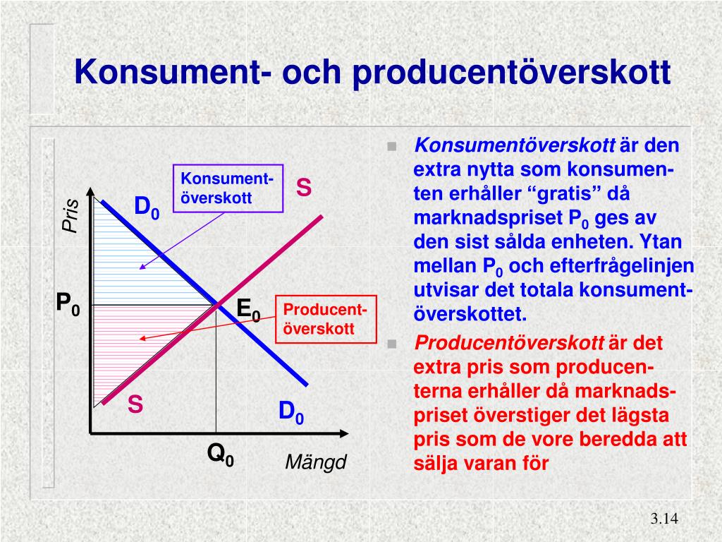 Konsument- och producentöverskott • Konsumentöverskott är den extra nytta som konsumen-ten erhåller “gratis” då marknadspriset P0 ges av den sist sålda enheten. Ytan mellan P0 och efterfrågelinjen utvisar det totala konsument-överskottet. • Producentöverskott är det extra pris som producen-terna erhåller då marknads-priset överstiger det lägsta pris som de vore beredda att sälja varan för Konsument- överskott S D0 Pris P0 E0 Producent- överskott S D0 Q0 Mängd
