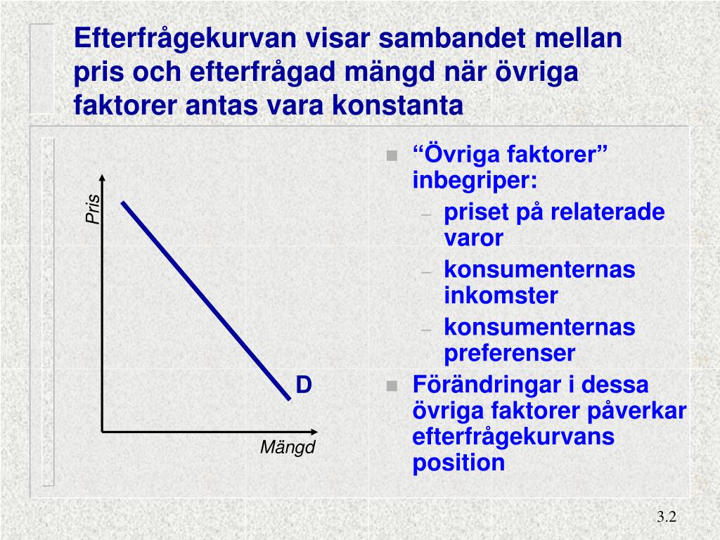 Efterfrågekurvan visar sambandet mellan pris och efterfrågad mängd när övriga faktorer antas vara konstanta • “Övriga faktorer” inbegriper: • priset på relaterade varor • konsumenternas inkomster • konsumenternas preferenser • Förändringar i dessa övriga faktorer påverkar efterfrågekurvans position Pris D Mängd