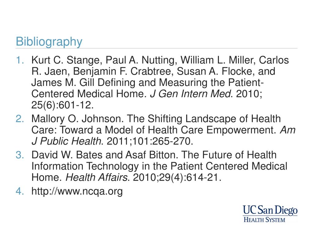 Bibliography • Kurt C. Stange, Paul A. Nutting, William L. Miller, Carlos R. Jaen, Benjamin F. Crabtree, Susan A. Flocke, and James M. Gill Defining and Measuring the Patient-Centered Medical Home. J Gen Intern Med. 2010; 25(6):601-12. • Mallory O. Johnson. The Shifting Landscape of Health Care: Toward a Model of Health Care Empowerment. Am J Public Health. 2011;101:265-270. • David W. Bates and AsafBitton. The Future of Health Information Technology in the Patient Centered Medical Home. Health Affairs. 2010;29(4):614-21. • http://www.ncqa.org