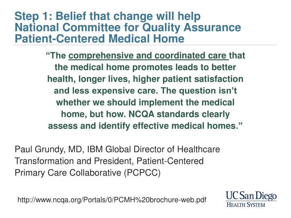 Step 1: Belief that change will helpNational Committee for Quality Assurance Patient-Centered Medical Home “The comprehensive and coordinated care that the medical home promotes leads to better health, longer lives, higher patient satisfaction and less expensive care. The question isn’t whether we should implement the medical home, but how. NCQA standards clearly assess and identify effective medical homes.” Paul Grundy, MD, IBM Global Director of Healthcare Transformation and President, Patient-Centered Primary Care Collaborative (PCPCC) http://www.ncqa.org/Portals/0/PCMH%20brochure-web.pdf