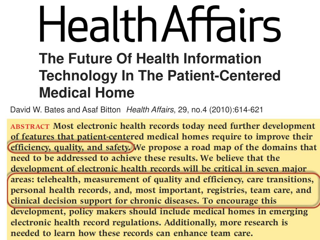 The Future Of Health Information Technology In The Patient-Centered Medical Home Health Affairs, 29, no.4 (2010):614-621 David W. Bates and AsafBitton
