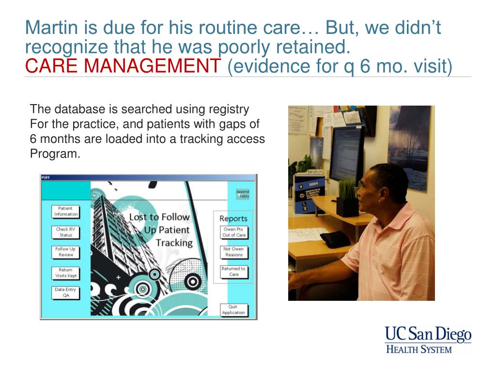 Martin is due for his routine care… But, we didn’t recognize that he was poorly retained.CARE MANAGEMENT (evidence for q 6 mo. visit) The database is searched using registry For the practice, and patients with gaps of 6 months are loaded into a tracking access Program.