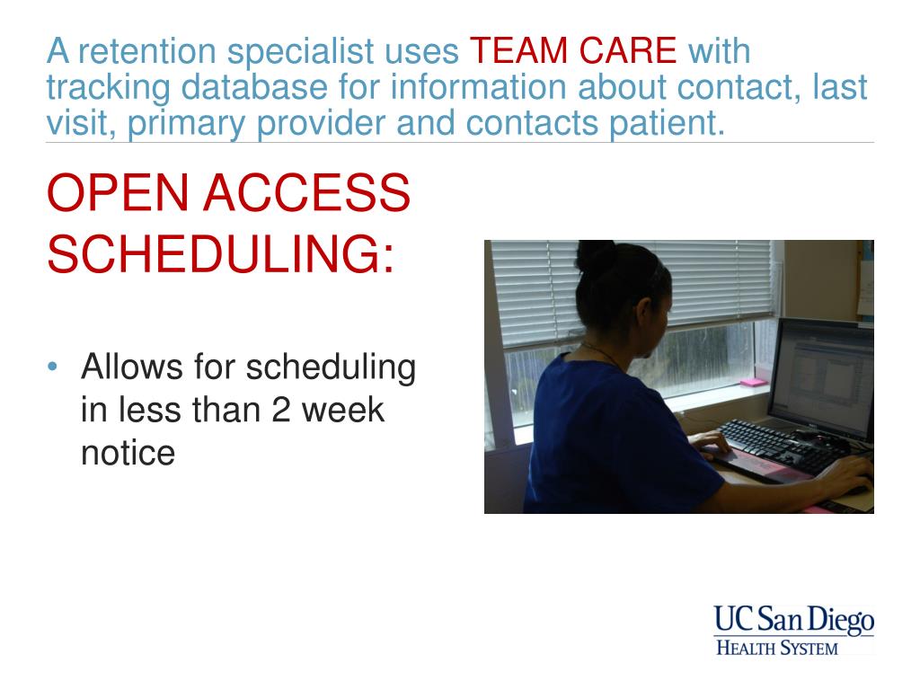 A retention specialist uses TEAM CARE with tracking database for information about contact, last visit, primary provider and contacts patient. OPEN ACCESS SCHEDULING: • Allows for scheduling in less than 2 week notice
