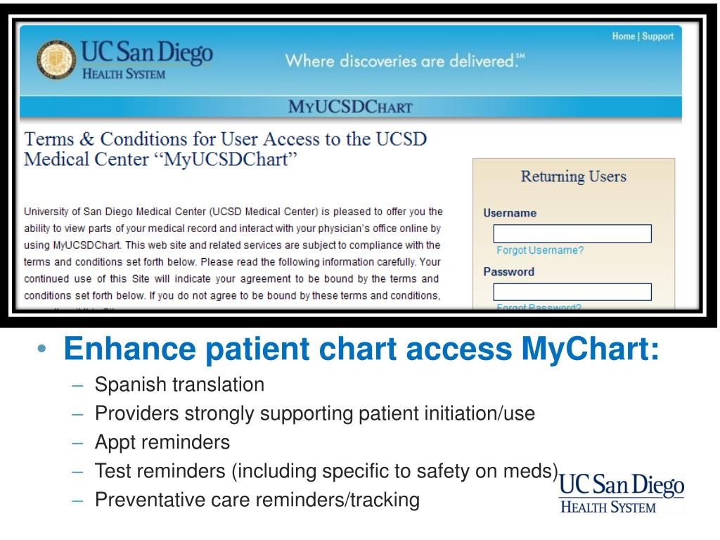 Enhance patient chart access MyChart: • Spanish translation • Providers strongly supporting patient initiation/use • Appt reminders • Test reminders (including specific to safety on meds) • Preventative care reminders/tracking