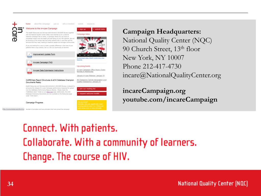 Campaign Headquarters:National Quality Center (NQC)90 Church Street, 13th floor New York, NY 10007Phone 212-417-4730 incare@NationalQualityCenter.orgincareCampaign.org youtube.com/incareCampaign