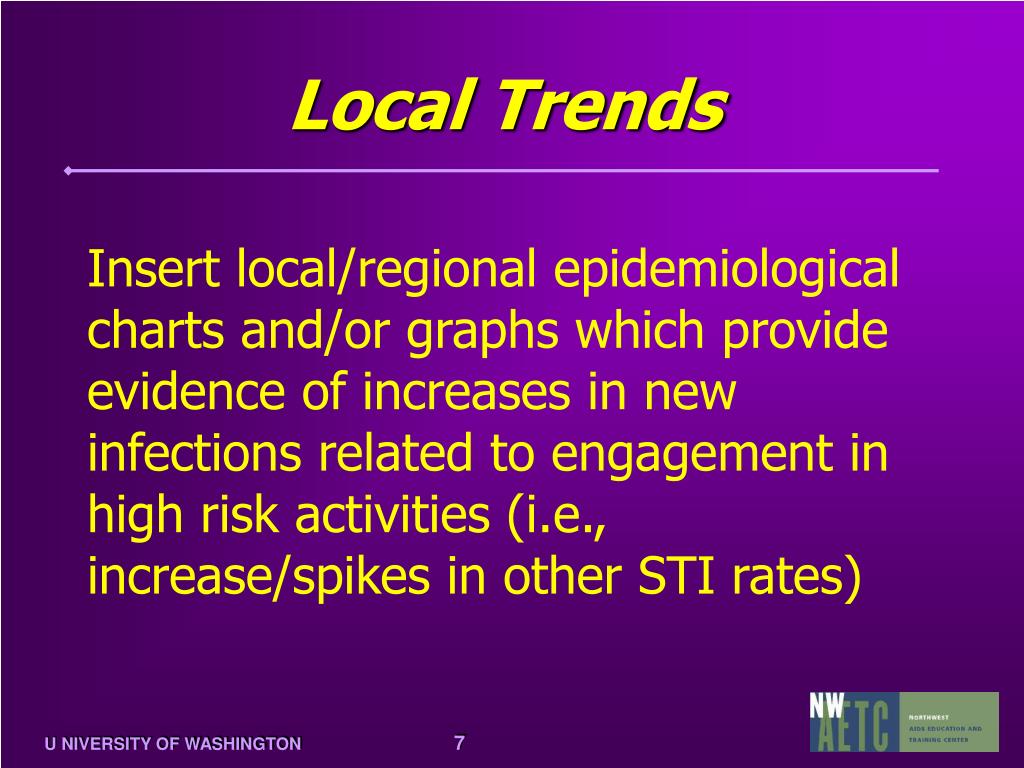 Local Trends • Insert local/regional epidemiological charts and/or graphs which provide evidence of increases in new infections related to engagement in high risk activities (i.e., increase/spikes in other STI rates)