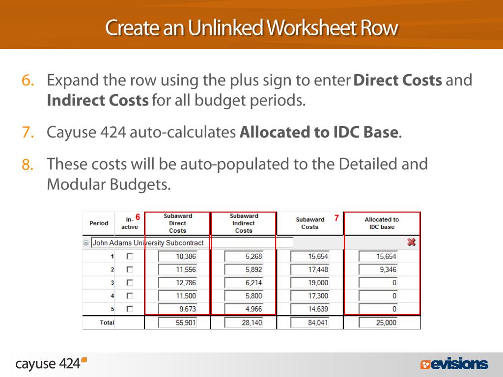Create an Unlinked Worksheet Row • Expand the row using the plus sign to enter Direct Costs and Indirect Costs for all budget periods. • Cayuse 424 auto-calculates Allocated to IDC Base. • These costs will be auto-populated to the Detailed and Modular Budgets.