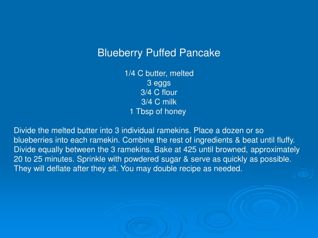 Blueberry Puffed Pancake 1/4 C butter, melted 3 eggs 3/4 C flour 3/4 C milk 1 Tbsp of honey Divide the melted butter into 3 individual ramekins. Place a dozen or so blueberries into each ramekin. Combine the rest of ingredients & beat until fluffy. Divide equally between the 3 ramekins. Bake at 425 until browned, approximately 20 to 25 minutes. Sprinkle with powdered sugar & serve as quickly as possible. They will deflate after they sit. You may double recipe as needed.