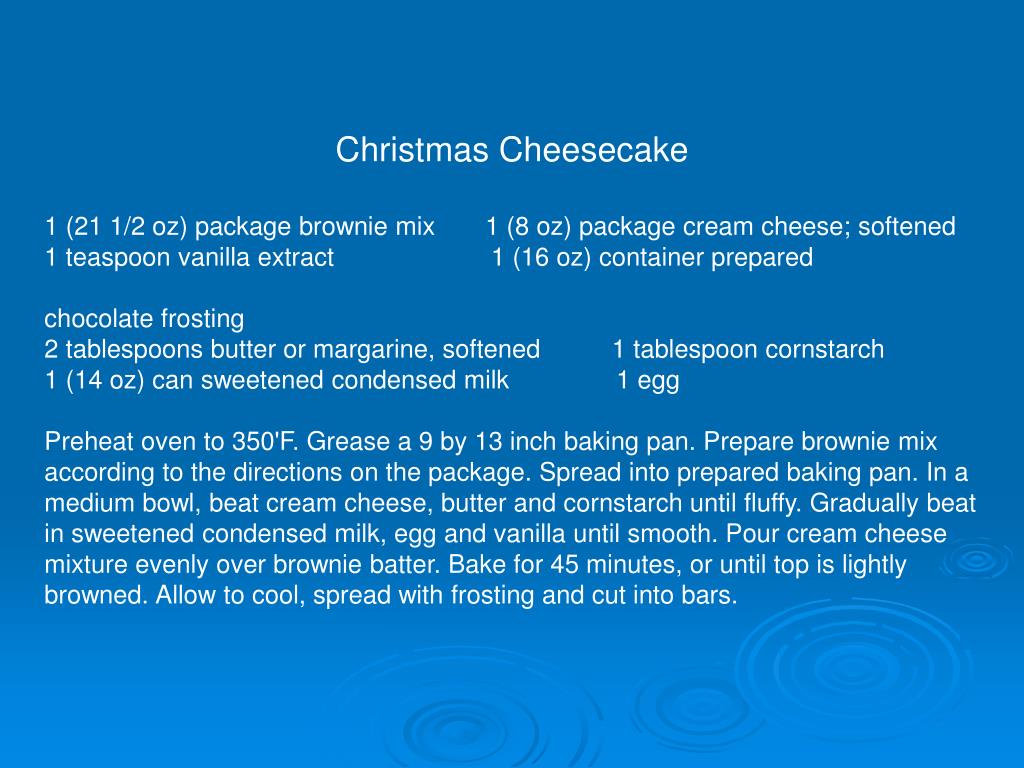 Christmas Cheesecake 1 (21 1/2 oz) package brownie mix 1 (8 oz) package cream cheese; softened 1 teaspoon vanilla extract 1 (16 oz) container prepared chocolate frosting 2 tablespoons butter or margarine, softened 1 tablespoon cornstarch 1 (14 oz) can sweetened condensed milk 1 egg Preheat oven to 350'F. Grease a 9 by 13 inch baking pan. Prepare brownie mix according to the directions on the package. Spread into prepared baking pan. In a medium bowl, beat cream cheese, butter and cornstarch until fluffy. Gradually beat in sweetened condensed milk, egg and vanilla until smooth. Pour cream cheese mixture evenly over brownie batter. Bake for 45 minutes, or until top is lightly browned. Allow to cool, spread with frosting and cut into bars.