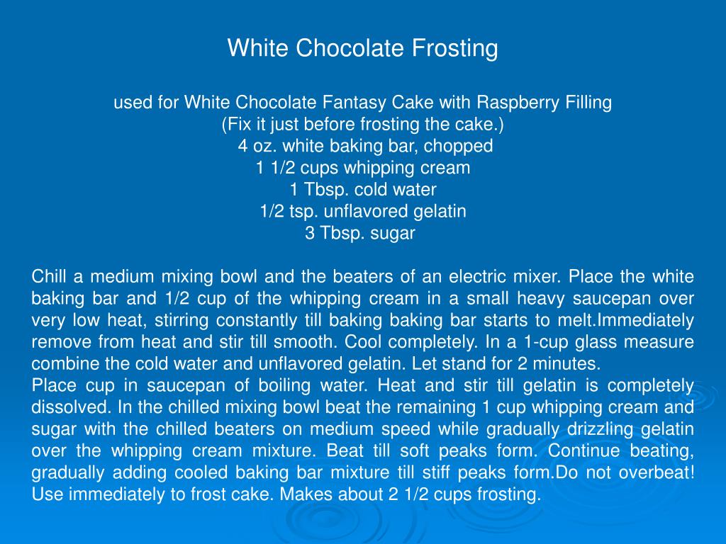 White Chocolate Frosting used for White Chocolate Fantasy Cake with Raspberry Filling (Fix it just before frosting the cake.) 4 oz. white baking bar, chopped 1 1/2 cups whipping cream 1 Tbsp. cold water 1/2 tsp. unflavored gelatin 3 Tbsp. sugar Chill a medium mixing bowl and the beaters of an electric mixer. Place the white baking bar and 1/2 cup of the whipping cream in a small heavy saucepan over very low heat, stirring constantly till baking baking bar starts to melt.Immediately remove from heat and stir till smooth. Cool completely. In a 1-cup glass measure combine the cold water and unflavored gelatin. Let stand for 2 minutes. Place cup in saucepan of boiling water. Heat and stir till gelatin is completely dissolved. In the chilled mixing bowl beat the remaining 1 cup whipping cream and sugar with the chilled beaters on medium speed while gradually drizzling gelatin over the whipping cream mixture. Beat till soft peaks form. Continue beating, gradually adding cooled baking bar mixture till stiff peaks form.Do not overbeat! Use immediately to frost cake. Makes about 2 1/2 cups frosting.