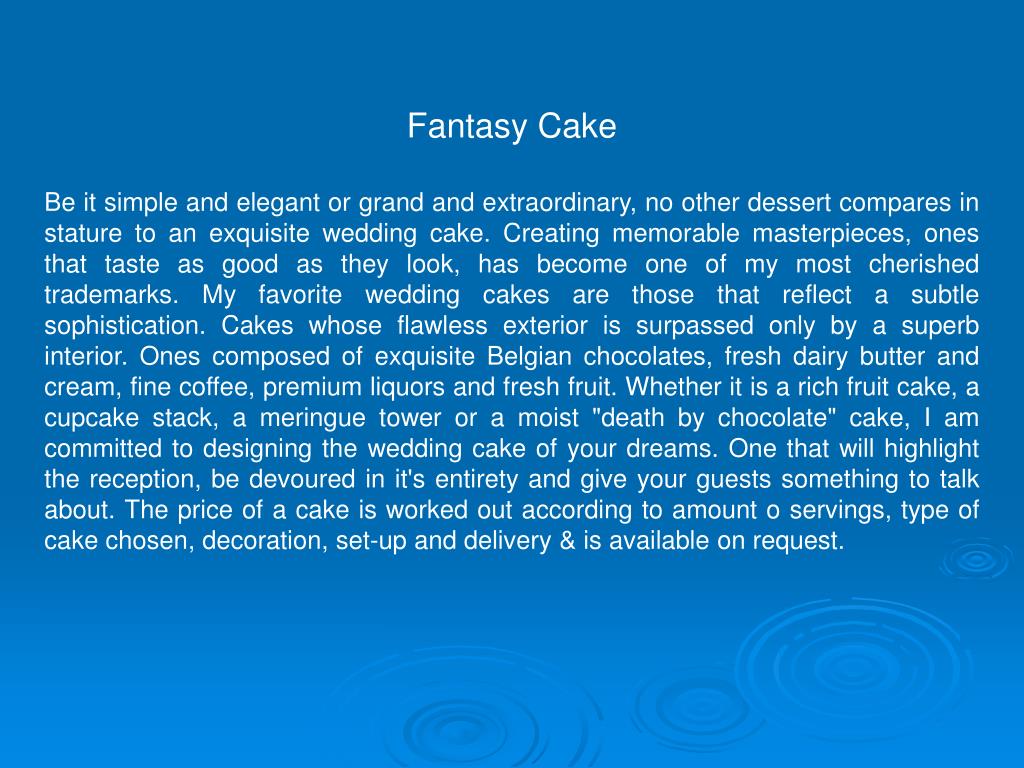 Fantasy Cake Be it simple and elegant or grand and extraordinary, no other dessert compares in stature to an exquisite wedding cake. Creating memorable masterpieces, ones that taste as good as they look, has become one of my most cherished trademarks. My favorite wedding cakes are those that reflect a subtle sophistication. Cakes whose flawless exterior is surpassed only by a superb interior. Ones composed of exquisite Belgian chocolates, fresh dairy butter and cream, fine coffee, premium liquors and fresh fruit. Whether it is a rich fruit cake, a cupcake stack, a meringue tower or a moist "death by chocolate" cake, I am committed to designing the wedding cake of your dreams. One that will highlight the reception, be devoured in it's entirety and give your guests something to talk about. The price of a cake is worked out according to amount o servings, type of cake chosen, decoration, set-up and delivery & is available on request.