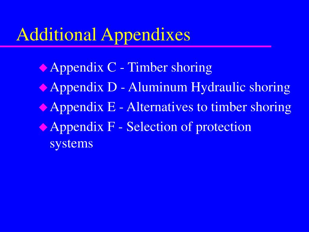 Appendices • Appendix A - Soil Classification • Appendix B - Sloping and Benching • Appendix C - Timber Shoring for Trenches • Appendix D - Aluminum Hydraulic Shoring for Trenches • Appendix E - Alternatives to Timber Shoring • Appendix F - Selection of Protection System
