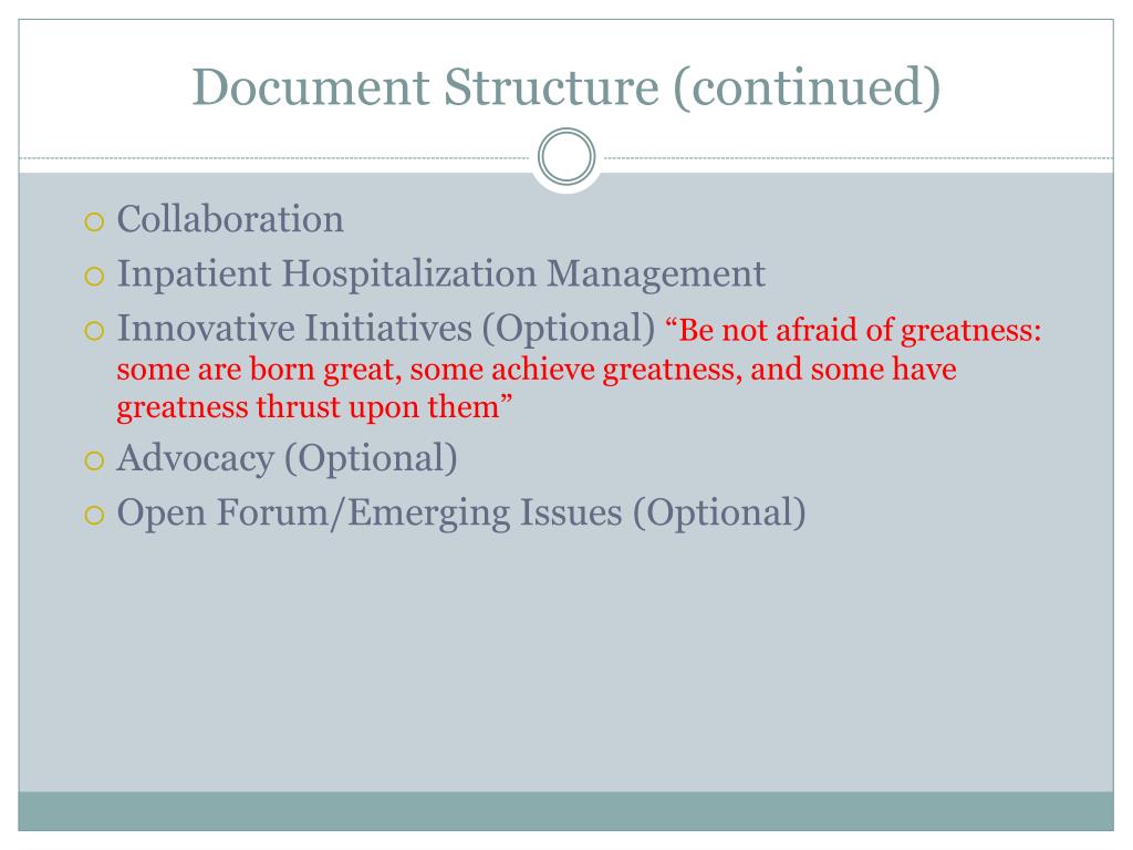 Document Structure (continued) • Collaboration • Inpatient Hospitalization Management • Innovative Initiatives (Optional) “Be not afraid of greatness: some are born great, some achieve greatness, and some have greatness thrust upon them” • Advocacy (Optional) • Open Forum/Emerging Issues (Optional)