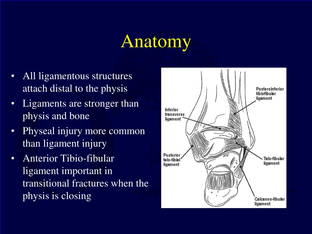 Anatomy • All ligamentous structures attach distal to the physis • Ligaments are stronger than physis and bone • Physeal injury more common than ligament injury • Anterior Tibio-fibular ligament important in transitional fractures when the physis is closing