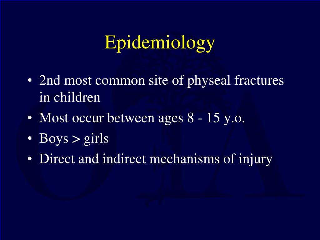 Epidemiology • 2nd most common site of physeal fractures in children • Most occur between ages 8 - 15 y.o. • Boys > girls • Direct and indirect mechanisms of injury