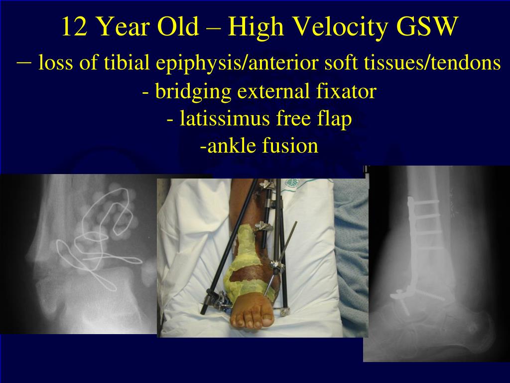 12 Year Old – High Velocity GSW – loss of tibial epiphysis/anterior soft tissues/tendons - bridging external fixator- latissimus free flap-ankle fusion