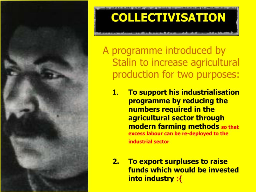 COLLECTIVISATION • A programme introduced by Stalin to increase agricultural production for two purposes: • 1. To support his industrialisation programme by reducing the numbers required in the agricultural sector through modern farming methods so that excess labour can be re-deployed to the industrial sector • 2. To export surpluses to raise funds which would be invested into industry :{