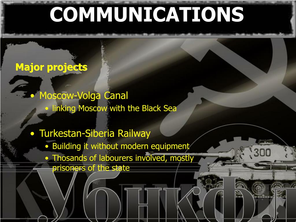 COMMUNICATIONS • Major projects • Moscow-Volga Canal • linking Moscow with the Black Sea • Turkestan-Siberia Railway • Building it without modern equipment • Thosands of labourers involved, mostly prisoners of the state