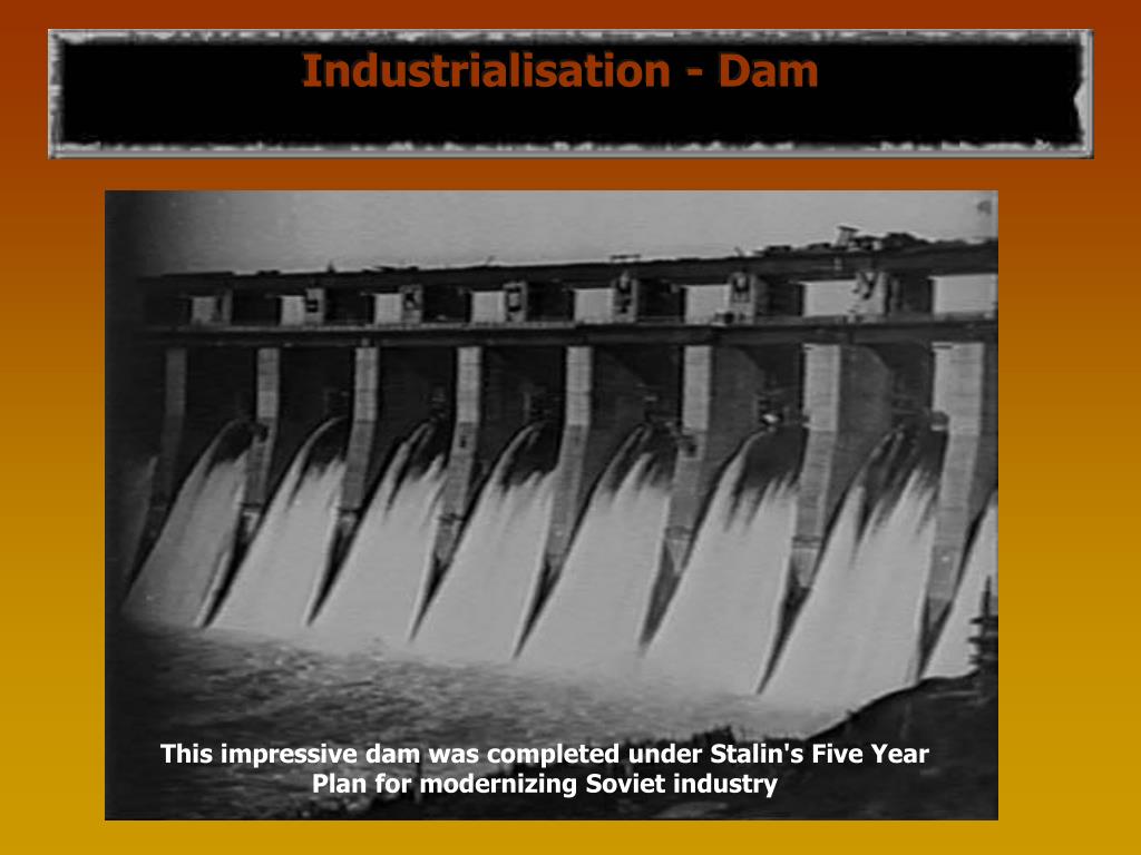Industrialisation - Dam This impressive dam was completed under Stalin's Five Year Plan for modernizing Soviet industry