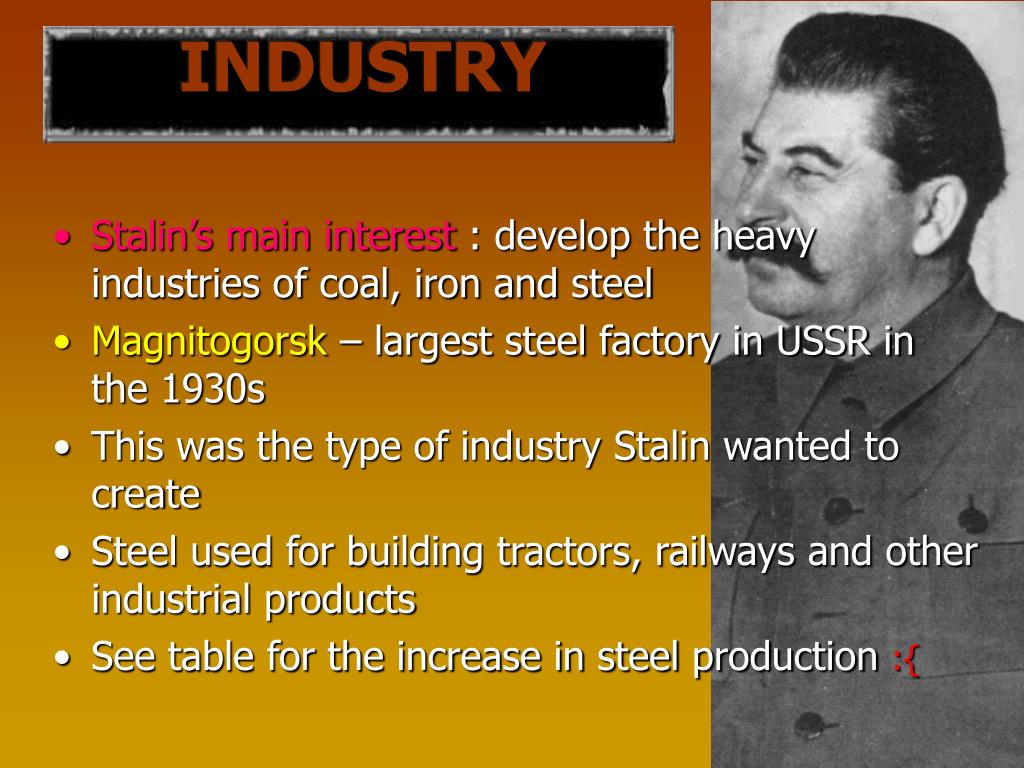 INDUSTRY • Stalin’s main interest : develop the heavy industries of coal, iron and steel • Magnitogorsk – largest steel factory in USSR in the 1930s • This was the type of industry Stalin wanted to create • Steel used for building tractors, railways and other industrial products • See table for the increase in steel production :{