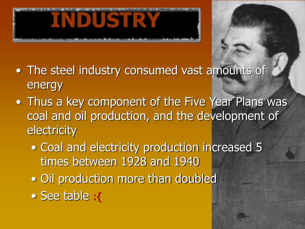 INDUSTRY • The steel industry consumed vast amounts of energy • Thus a key component of the Five Year Plans was coal and oil production, and the development of electricity • Coal and electricity production increased 5 times between 1928 and 1940 • Oil production more than doubled • See table :{