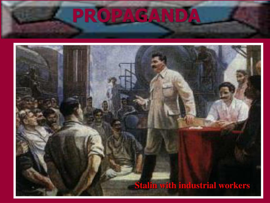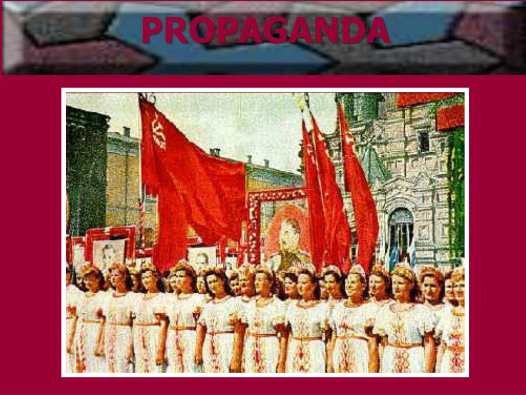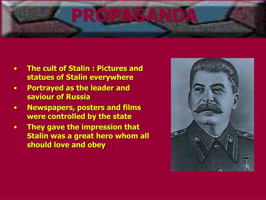 PROPAGANDA • The cult of Stalin : Pictures and statues of Stalin everywhere • Portrayed as the leader and saviour of Russia • Newspapers, posters and films were controlled by the state • They gave the impression that Stalin was a great hero whom all should love and obey :{