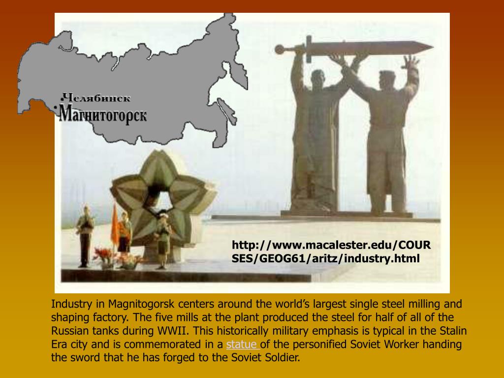 http://www.macalester.edu/COURSES/GEOG61/aritz/industry.html Industry in Magnitogorsk centers around the world’s largest single steel milling and shaping factory. The five mills at the plant produced the steel for half of all of the Russian tanks during WWII. This historically military emphasis is typical in the Stalin Era city and is commemorated in a statueof the personified Soviet Worker handing the sword that he has forged to the Soviet Soldier.