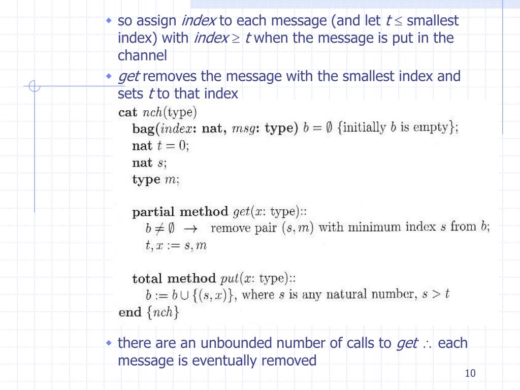 so assign index to each message (and let t smallest index) with index t when the message is put in the channel • get removes the message with the smallest index and sets t to that index • there are an unbounded number of calls to get each message is eventually removed