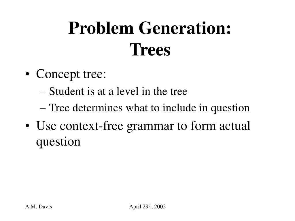 Problem Generation:Trees • Concept tree: • Student is at a level in the tree • Tree determines what to include in question • Use context-free grammar to form actual question April 29th, 2002
