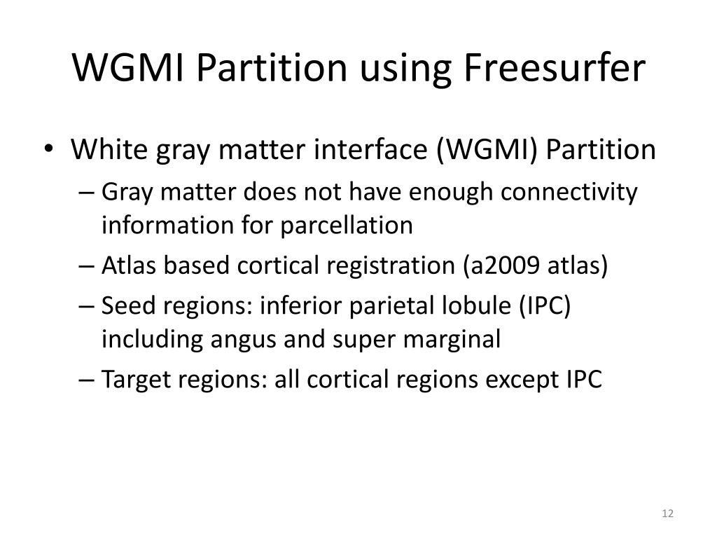WGMI Partition using Freesurfer • White gray matter interface (WGMI) Partition • Gray matter does not have enough connectivity information for parcellation • Atlas based cortical registration (a2009 atlas) • Seed regions: inferior parietal lobule (IPC) including angus and super marginal • Target regions: all cortical regions except IPC